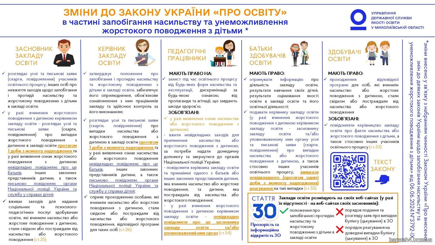 План заходів, про організацію роботи ліцею у сфері запоігання та протидії запобіганню насилля та жорстокого поводження з дітьми в Барському ліцеї №4